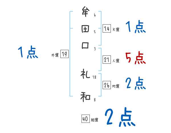 人運![]() | 牟田口礼和さんの人運は21画の5つ星!統率力がある。独立し成功する。名誉を手に入れる。 性格や才能などを表す2番目に重要な運勢です。人間関係や協調性、社会的な成功に影響します。主に20歳から50歳ぐらいまでの中年期の運勢を表します。 |