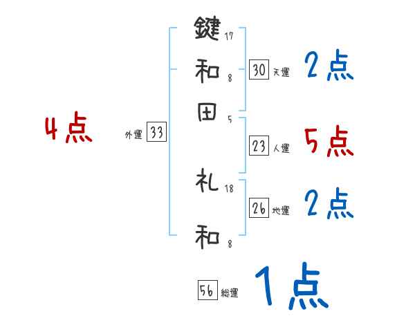 人運![]() | 鍵和田礼和さんの人運は23画の5つ星!想像力に優れ活力がある。一代で成功し名誉を手に入れる。 性格や才能などを表す2番目に重要な運勢です。人間関係や協調性、社会的な成功に影響します。主に20歳から50歳ぐらいまでの中年期の運勢を表します。 |