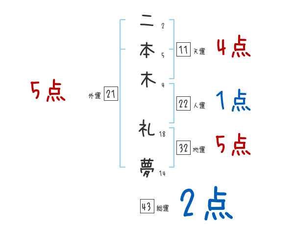 天運![]() | 二本木礼夢さんの天運は11画の4つ星!着実に富や地位を得る幸運な人生。 家系が持つ宿命的な運勢を表します。祖先から受け継いだ苗字ですので自分の力が及びません。家柄を象徴します。 |
