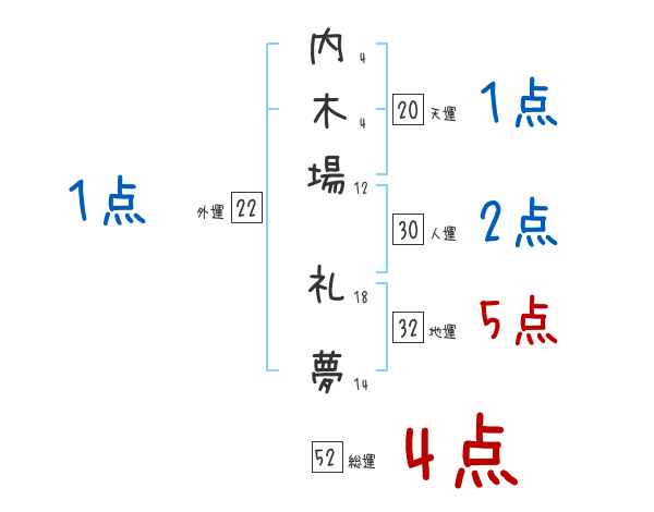 外運![]() | 内木場礼夢さんの外運は22画の1つ星!努力することが苦手ないっぽう手先が器用。芸術性にも優れる。 生活面を象徴する運勢です。外部から受ける影響力を表し、結婚運、家庭運や職場、環境への順応性を表します。 |