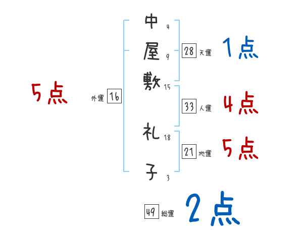 天運![]() | 中屋敷礼子さんの天運は28画の1つ星!家庭環境に注意。スポーツで活躍できる能力があるかも。 家系が持つ宿命的な運勢を表します。祖先から受け継いだ苗字ですので自分の力が及びません。家柄を象徴します。 |