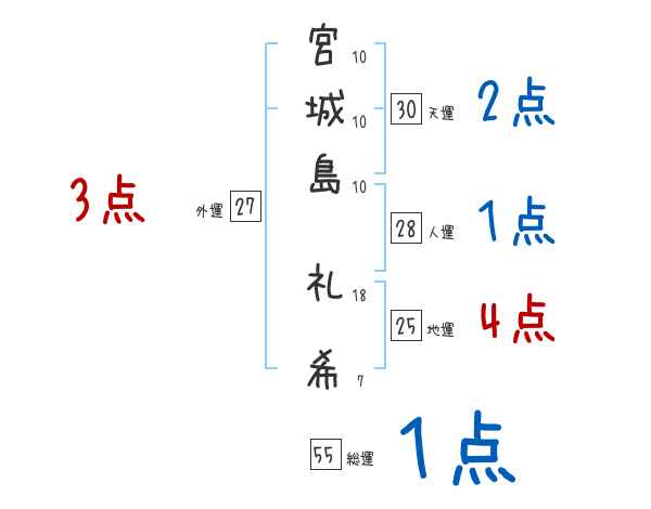 人運![]() | 宮城島礼希さんの人運は28画の1つ星!家庭環境に注意。スポーツで活躍できる能力があるかも。 性格や才能などを表す2番目に重要な運勢です。人間関係や協調性、社会的な成功に影響します。主に20歳から50歳ぐらいまでの中年期の運勢を表します。 |