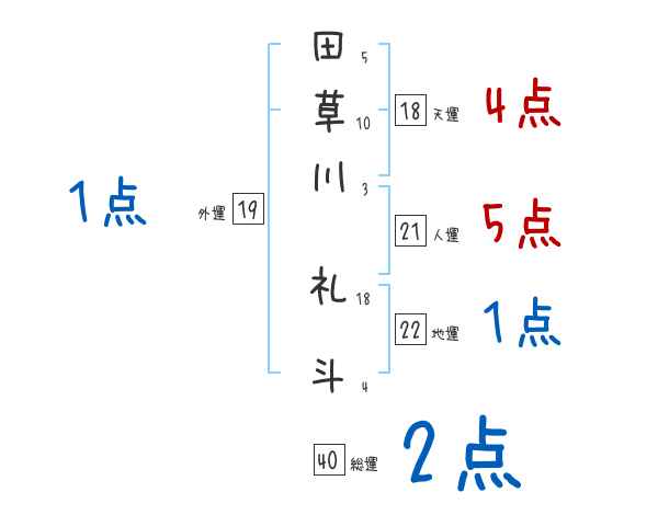 天運![]() | 田草川礼斗さんの天運は18画の4つ星!情熱的で剛気。忍耐力があり信頼される。 家系が持つ宿命的な運勢を表します。祖先から受け継いだ苗字ですので自分の力が及びません。家柄を象徴します。 |