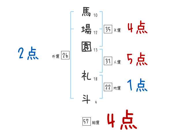 総運![]() | 馬場園礼斗さんの総運は57画の4つ星!向上心があり人望がある。地位を得る。 あなたの人生を表す1番重要な運勢です。生涯を通じて影響する総合運となり、主に50歳以降の晩年期に影響を及ぼします。 |