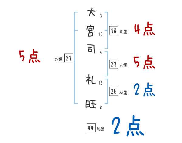 天運![]() | 大宮司礼旺さんの天運は18画の4つ星!情熱的で剛気。忍耐力があり信頼される。 家系が持つ宿命的な運勢を表します。祖先から受け継いだ苗字ですので自分の力が及びません。家柄を象徴します。 |