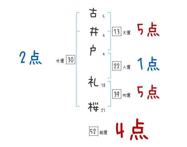 地運![]() | 古井戸礼桜さんの地運は39画の5つ星!社交性に優れ人望が厚い。人の上に立ち成功する。 個性を表す基礎的な運勢です。性格形成や対人関係、行動力など家庭環境に影響されます。主に誕生してから20歳くらいまでの若年期の運勢を表します。 |