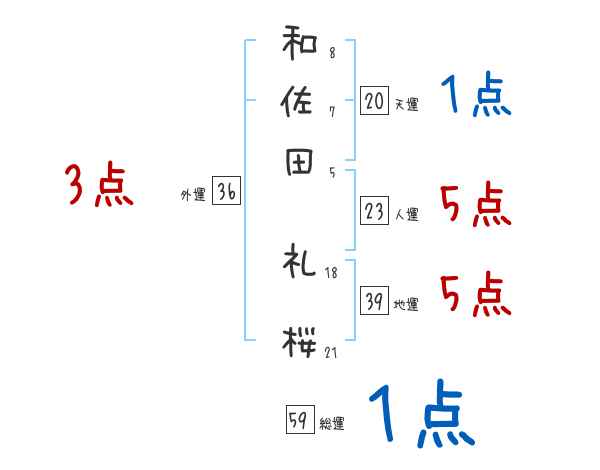 総運![]() | 和佐田礼桜さんの総運は59画の1つ星!意志の弱さであきらめることが多いかも。粘り強さが必要。 あなたの人生を表す1番重要な運勢です。生涯を通じて影響する総合運となり、主に50歳以降の晩年期に影響を及ぼします。 |