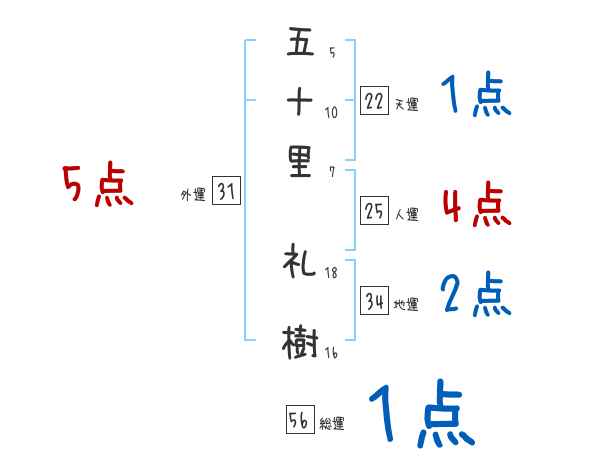 天運![]() | 五十里礼樹さんの天運は22画の1つ星!努力することが苦手ないっぽう手先が器用。芸術性にも優れる。 家系が持つ宿命的な運勢を表します。祖先から受け継いだ苗字ですので自分の力が及びません。家柄を象徴します。 |