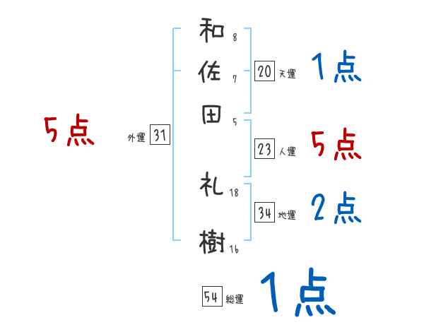 人運![]() | 和佐田礼樹さんの人運は23画の5つ星!想像力に優れ活力がある。一代で成功し名誉を手に入れる。 性格や才能などを表す2番目に重要な運勢です。人間関係や協調性、社会的な成功に影響します。主に20歳から50歳ぐらいまでの中年期の運勢を表します。 |