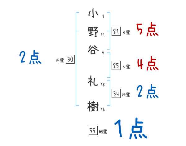 天運![]() | 小野谷礼樹さんの天運は21画の5つ星!統率力がある。独立し成功する。名誉を手に入れる。 家系が持つ宿命的な運勢を表します。祖先から受け継いだ苗字ですので自分の力が及びません。家柄を象徴します。 |