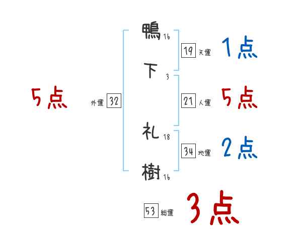 外運![]() | 鴨下礼樹さんの外運は32画の5つ星!柔軟性があり成功する。チャンスが多く金運が良い。 生活面を象徴する運勢です。外部から受ける影響力を表し、結婚運、家庭運や職場、環境への順応性を表します。 |