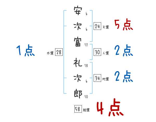 天運![]() | 安次富礼次郎さんの天運は24画の5つ星!家庭運が良く順調な人生。金運にも恵まれる。 家系が持つ宿命的な運勢を表します。祖先から受け継いだ苗字ですので自分の力が及びません。家柄を象徴します。 |