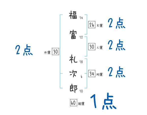 総運![]() | 福富礼次郎さんの総運は60画の1つ星!悲観的で迷いやすい。波乱が多く損をしないように。 あなたの人生を表す1番重要な運勢です。生涯を通じて影響する総合運となり、主に50歳以降の晩年期に影響を及ぼします。 |