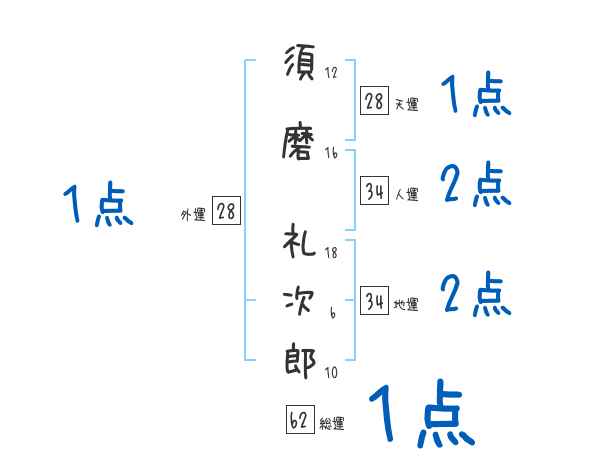 外運![]() | 須磨礼次郎さんの外運は28画の1つ星!家庭環境に注意。スポーツで活躍できる能力があるかも。 生活面を象徴する運勢です。外部から受ける影響力を表し、結婚運、家庭運や職場、環境への順応性を表します。 |