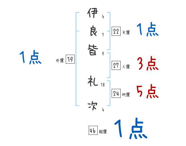 地運![]() | 伊良皆礼次さんの地運は24画の5つ星!家庭運が良く順調な人生。金運にも恵まれる。 個性を表す基礎的な運勢です。性格形成や対人関係、行動力など家庭環境に影響されます。主に誕生してから20歳くらいまでの若年期の運勢を表します。 |