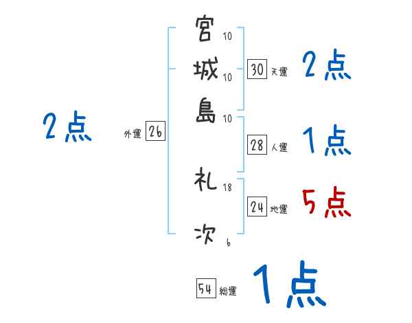 天運![]() | 宮城島礼次さんの天運は30画の2つ星!浮き沈みの激しさに注意しましょう。 家系が持つ宿命的な運勢を表します。祖先から受け継いだ苗字ですので自分の力が及びません。家柄を象徴します。 |
