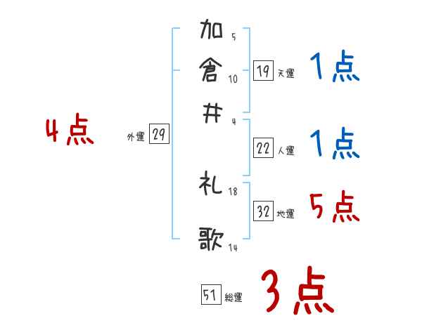 人運![]() | 加倉井礼歌さんの人運は22画の1つ星!努力することが苦手ないっぽう手先が器用。芸術性にも優れる。 性格や才能などを表す2番目に重要な運勢です。人間関係や協調性、社会的な成功に影響します。主に20歳から50歳ぐらいまでの中年期の運勢を表します。 |