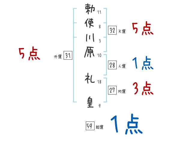 天運![]() | 勅使川原礼皇さんの天運は32画の5つ星!柔軟性があり成功する。チャンスが多く金運が良い。 家系が持つ宿命的な運勢を表します。祖先から受け継いだ苗字ですので自分の力が及びません。家柄を象徴します。 |