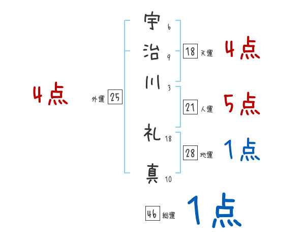天運![]() | 宇治川礼真さんの天運は18画の4つ星!情熱的で剛気。忍耐力があり信頼される。 家系が持つ宿命的な運勢を表します。祖先から受け継いだ苗字ですので自分の力が及びません。家柄を象徴します。 |