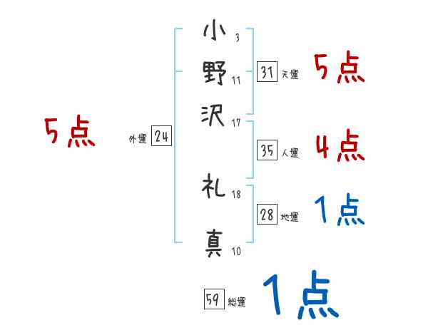 総運![]() | 小野沢礼真さんの総運は59画の1つ星!意志の弱さであきらめることが多いかも。粘り強さが必要。 あなたの人生を表す1番重要な運勢です。生涯を通じて影響する総合運となり、主に50歳以降の晩年期に影響を及ぼします。 |