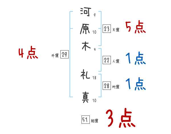 外運![]() | 河原木礼真さんの外運は29画の4つ星!完全主義で才能がある。厳格な心の持ち主。 生活面を象徴する運勢です。外部から受ける影響力を表し、結婚運、家庭運や職場、環境への順応性を表します。 |