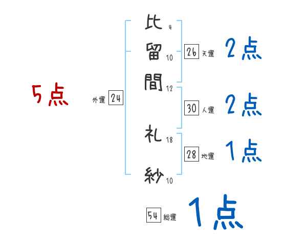 | 総運  | 比留間礼紗さんの総運は54画の1つ星!トラブルが多いかも。周りをよく見て協調して過ごしましょう。あなたの人生を表す1番重要な運勢です。生涯を通じて影響する総合運となり、主に50歳以降の晩年期に影響を及ぼします。 |