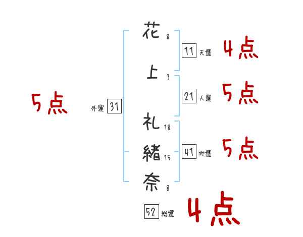 人運![]() | 花上礼緒奈さんの人運は21画の5つ星!統率力がある。独立し成功する。名誉を手に入れる。 性格や才能などを表す2番目に重要な運勢です。人間関係や協調性、社会的な成功に影響します。主に20歳から50歳ぐらいまでの中年期の運勢を表します。 |
