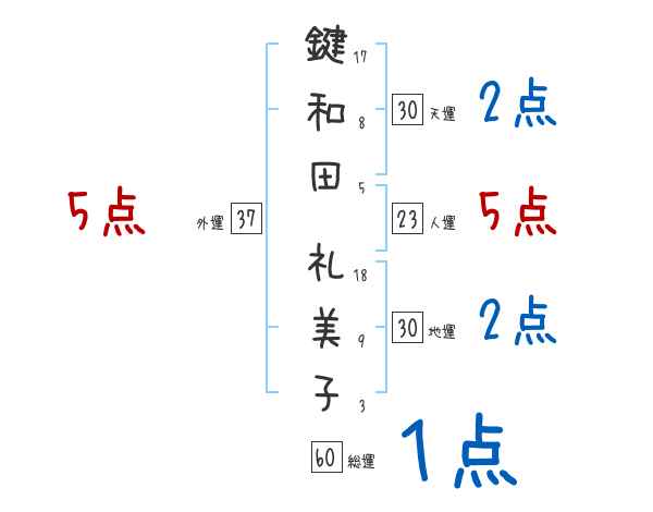 天運![]() | 鍵和田礼美子さんの天運は30画の2つ星!浮き沈みの激しさに注意しましょう。 家系が持つ宿命的な運勢を表します。祖先から受け継いだ苗字ですので自分の力が及びません。家柄を象徴します。 |