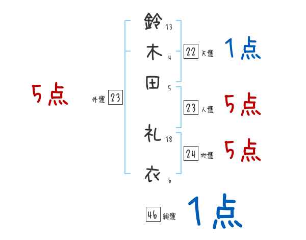 人運![]() | 鈴木田礼衣さんの人運は23画の5つ星!想像力に優れ活力がある。一代で成功し名誉を手に入れる。 性格や才能などを表す2番目に重要な運勢です。人間関係や協調性、社会的な成功に影響します。主に20歳から50歳ぐらいまでの中年期の運勢を表します。 |