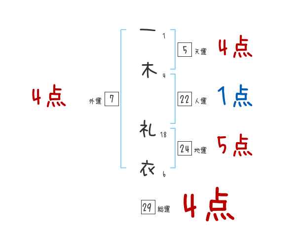 天運![]() | 一木礼衣さんの天運は5画の4つ星!健康で安泰。協調性に優れ、財産に恵まれる。 家系が持つ宿命的な運勢を表します。祖先から受け継いだ苗字ですので自分の力が及びません。家柄を象徴します。 |