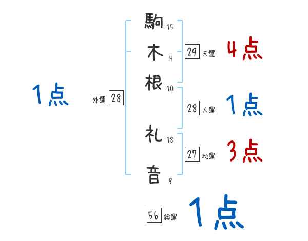 外運![]() | 駒木根礼音さんの外運は28画の1つ星!家庭環境に注意。スポーツで活躍できる能力があるかも。 生活面を象徴する運勢です。外部から受ける影響力を表し、結婚運、家庭運や職場、環境への順応性を表します。 |