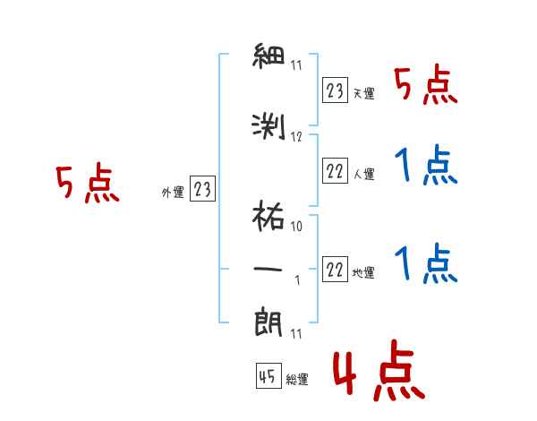 天運![]() | 細渕祐一朗さんの天運は23画の5つ星!想像力に優れ活力がある。一代で成功し名誉を手に入れる。 家系が持つ宿命的な運勢を表します。祖先から受け継いだ苗字ですので自分の力が及びません。家柄を象徴します。 |