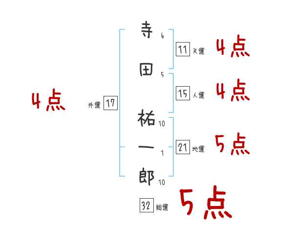天運![]() | 寺田祐一郎さんの天運は11画の4つ星!着実に富や地位を得る幸運な人生。 家系が持つ宿命的な運勢を表します。祖先から受け継いだ苗字ですので自分の力が及びません。家柄を象徴します。 |