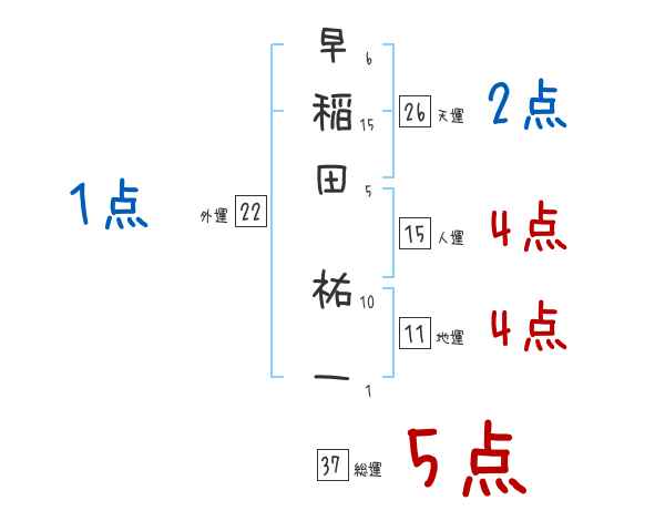外運![]() | 早稲田祐一さんの外運は22画の1つ星!努力することが苦手ないっぽう手先が器用。芸術性にも優れる。 生活面を象徴する運勢です。外部から受ける影響力を表し、結婚運、家庭運や職場、環境への順応性を表します。 |