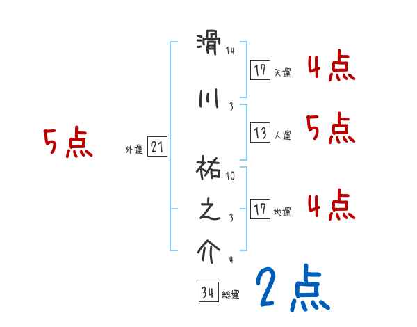 総運![]() | 滑川祐之介さんの総運は34画の2つ星!独創性に優れるが、自尊心が強く災難に注意しましょう。 あなたの人生を表す1番重要な運勢です。生涯を通じて影響する総合運となり、主に50歳以降の晩年期に影響を及ぼします。 |