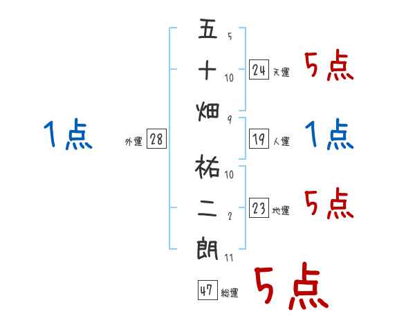 総運![]() | 五十畑祐二朗さんの総運は47画の5つ星!実力が開花し発展する円満な人生。財に恵まれる。 あなたの人生を表す1番重要な運勢です。生涯を通じて影響する総合運となり、主に50歳以降の晩年期に影響を及ぼします。 |