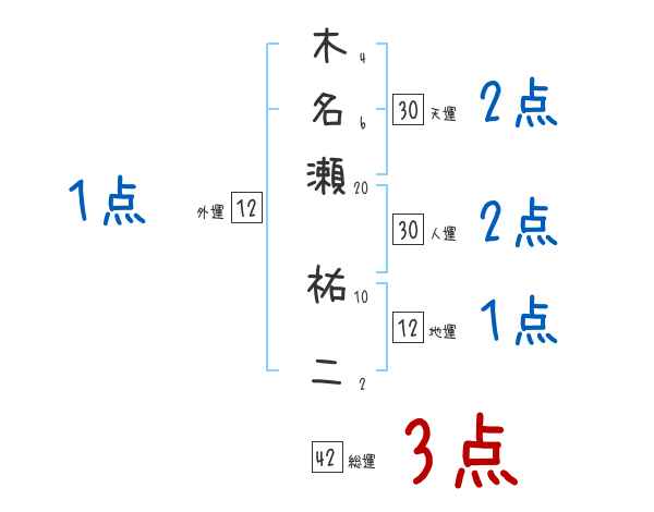 天運![]() | 木名瀬祐二さんの天運は30画の2つ星!浮き沈みの激しさに注意しましょう。 家系が持つ宿命的な運勢を表します。祖先から受け継いだ苗字ですので自分の力が及びません。家柄を象徴します。 |