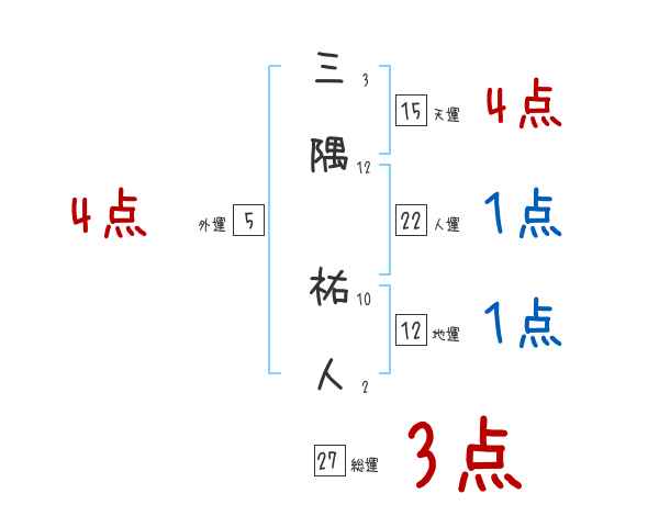 外運![]() | 三隅祐人さんの外運は5画の4つ星!健康で安泰。協調性に優れ、財産に恵まれる。 生活面を象徴する運勢です。外部から受ける影響力を表し、結婚運、家庭運や職場、環境への順応性を表します。 |