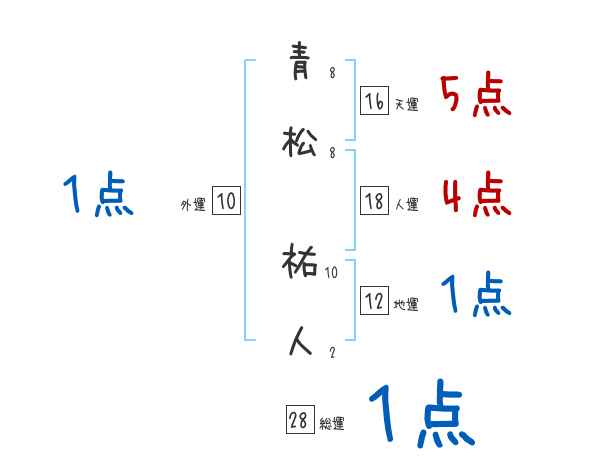 総運![]() | 青松祐人さんの総運は28画の1つ星!家庭環境に注意。スポーツで活躍できる能力があるかも。 あなたの人生を表す1番重要な運勢です。生涯を通じて影響する総合運となり、主に50歳以降の晩年期に影響を及ぼします。 |