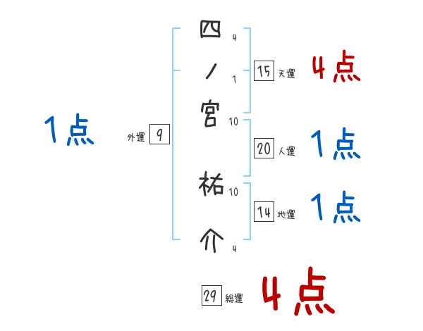 天運![]() | 四ノ宮祐介さんの天運は15画の4つ星!人徳があり出世する。順調に物事を進め円満な人生。 家系が持つ宿命的な運勢を表します。祖先から受け継いだ苗字ですので自分の力が及びません。家柄を象徴します。 |