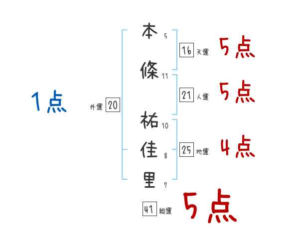 人運![]() | 本條祐佳里さんの人運は21画の5つ星!統率力がある。独立し成功する。名誉を手に入れる。 性格や才能などを表す2番目に重要な運勢です。人間関係や協調性、社会的な成功に影響します。主に20歳から50歳ぐらいまでの中年期の運勢を表します。 |