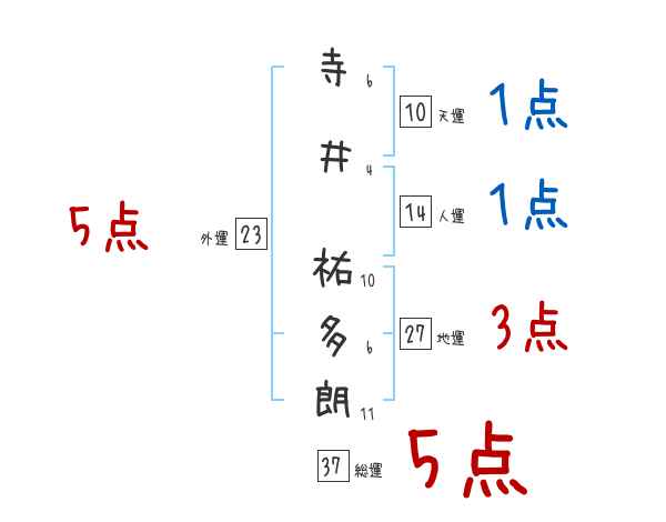 外運![]() | 寺井祐多朗さんの外運は23画の5つ星!想像力に優れ活力がある。一代で成功し名誉を手に入れる。 生活面を象徴する運勢です。外部から受ける影響力を表し、結婚運、家庭運や職場、環境への順応性を表します。 |