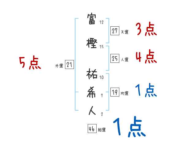 総運![]() | 富樫祐希人さんの総運は46画の1つ星!迷走することが多く苦労するかも。目先のことにとらわれないように。 あなたの人生を表す1番重要な運勢です。生涯を通じて影響する総合運となり、主に50歳以降の晩年期に影響を及ぼします。 |