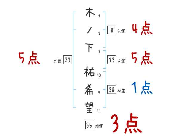 外運![]() | 木ノ下祐希望さんの外運は23画の5つ星!想像力に優れ活力がある。一代で成功し名誉を手に入れる。 生活面を象徴する運勢です。外部から受ける影響力を表し、結婚運、家庭運や職場、環境への順応性を表します。 |