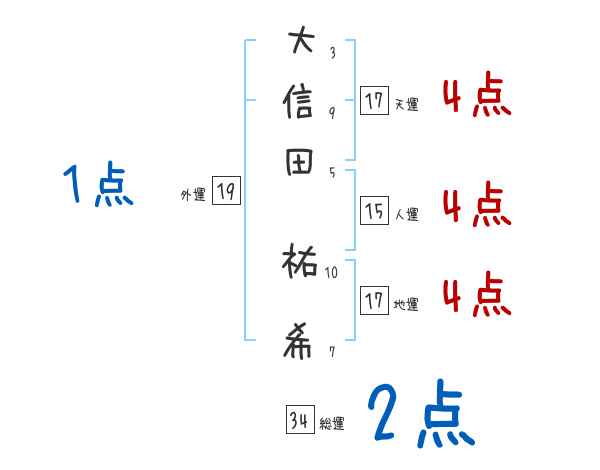 総運![]() | 大信田祐希さんの総運は34画の2つ星!独創性に優れるが、自尊心が強く災難に注意しましょう。 あなたの人生を表す1番重要な運勢です。生涯を通じて影響する総合運となり、主に50歳以降の晩年期に影響を及ぼします。 |