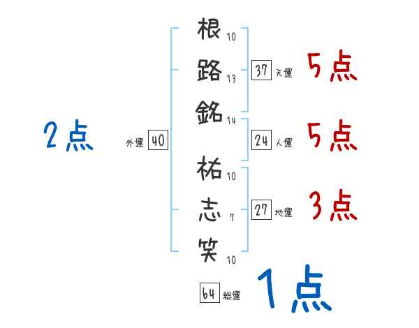 人運![]() | 根路銘祐志笑さんの人運は24画の5つ星!家庭運が良く順調な人生。金運にも恵まれる。 性格や才能などを表す2番目に重要な運勢です。人間関係や協調性、社会的な成功に影響します。主に20歳から50歳ぐらいまでの中年期の運勢を表します。 |