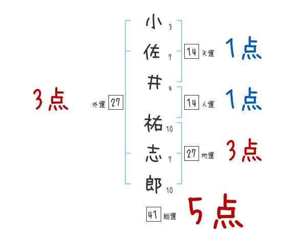 外運![]() | 小佐井祐志郎さんの外運は27画の3つ星!頭脳明晰だが強情で摩擦が多い傾向。孤立に注意。 生活面を象徴する運勢です。外部から受ける影響力を表し、結婚運、家庭運や職場、環境への順応性を表します。 |