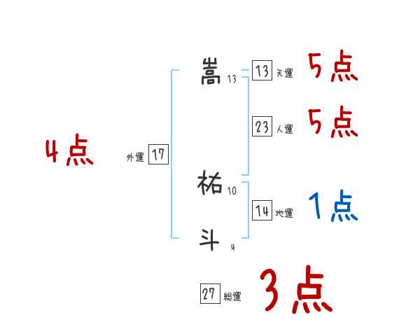 外運![]() | 嵩祐斗さんの外運は17画の4つ星!積極的な行動力。地位を気づき財産を手に入れる。純粋な心と直感力。 生活面を象徴する運勢です。外部から受ける影響力を表し、結婚運、家庭運や職場、環境への順応性を表します。 |