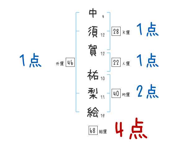天運![]() | 中須賀祐梨絵さんの天運は28画の1つ星!家庭環境に注意。スポーツで活躍できる能力があるかも。 家系が持つ宿命的な運勢を表します。祖先から受け継いだ苗字ですので自分の力が及びません。家柄を象徴します。 |