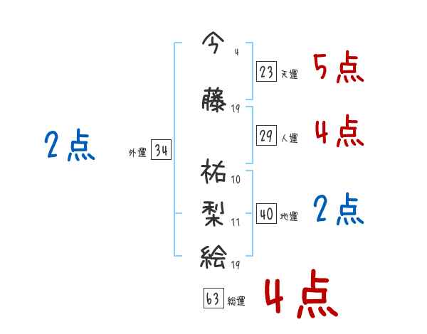 天運![]() | 今藤祐梨絵さんの天運は23画の5つ星!想像力に優れ活力がある。一代で成功し名誉を手に入れる。 家系が持つ宿命的な運勢を表します。祖先から受け継いだ苗字ですので自分の力が及びません。家柄を象徴します。 |